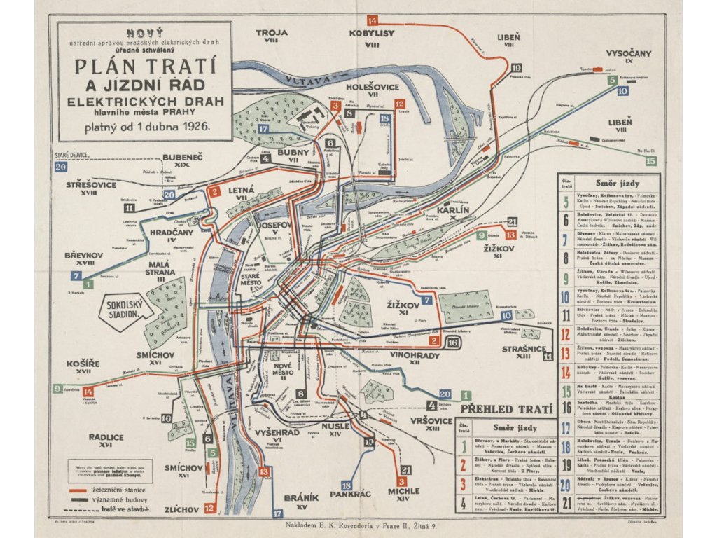 Tento pražský dopravní plán z roku 1926 vás vrátí do doby, kdy městem vládly „elektrické dráhy“ a tramvajová síť se rychle rozrůstala. Mapa zobrazuje trasování linek s čísly, důležité úseky a uzly, a přitom zachovává krásnou přehlednost díky kontrastním barvám a jasné legendě. Nejde jen o mapu pro orientaci – je to i malý příběh města: uvidíte tehdejší názvy čtvrtí, tok Vltavy i místa, která dodnes tvoří srdce Prahy. Grafika první republiky, jemné patinované tóny a typické dobové písmo z ní dělají výjimečný dekorativní kousek. Hodí se pro milovníky historie, starých map i městské dopravy a skvěle doplní interiér, kde má být něco originálního a „pražského“ na první pohled.